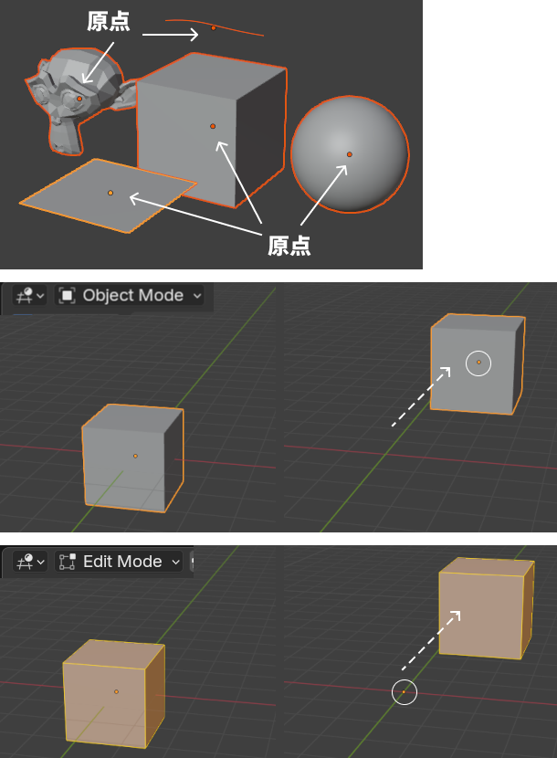 Tabで編集モード画面に入り、オブジェクトを移動させると原点はその場に残ります。