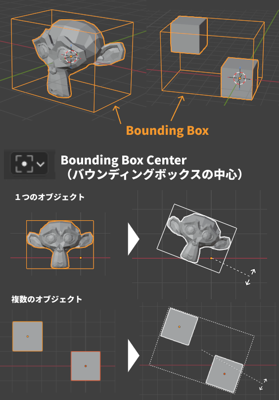 後でも述べますが、複数のオブジェクトを操作するときには、バウンディングボックスの中心が基準になります。