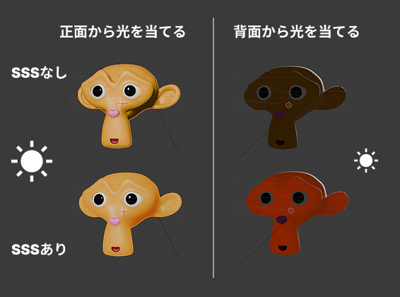 正面から光を当てたとき、SSS光は物体の内部に入り別の方向へ散乱し出ていきます。影の部分にも光が広がり、内部の色が出てくるので、柔らかい見え方になります。