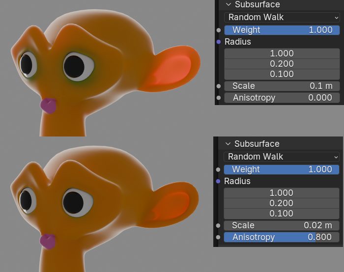 Anisotropyは異方性で、サブサーフェス・スキャタリング(光が物体表面を透過して内部で拡散・散乱する現象)の散乱が特定の方向に偏る度合いです。0だと全方向に均一に散乱し、数値が高いほど前方に偏ります。