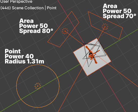 ライト:耳や鼻などにSSS光を出すためキャラクターの後ろ側にエリアライト2個(ホワイト)。Spreadの値もSSS光に影響が出る。あまりに光が拡散しているとSSS光も弱くなる。