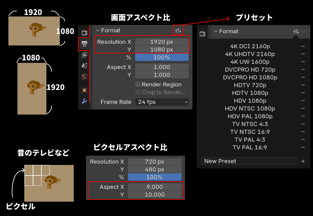 「Aspect X」と「Aspect Y」を調整することで、ピクセルアスペクト比を変更できます。画面のアスペクト比とは違い、画面を構成する1つ1つのピクセルのアスペクトです。例えば昔のテレビは9:10くらいで少し縦長のピクセルをしていました。現代はほとんどの画面のピクセルアスペクト比は1:1なので、特殊なスクリーンでない限りは構わなくても大丈夫です。