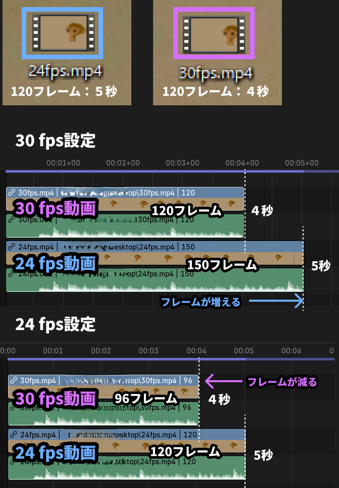 フレームレートの違う動画を置くと、