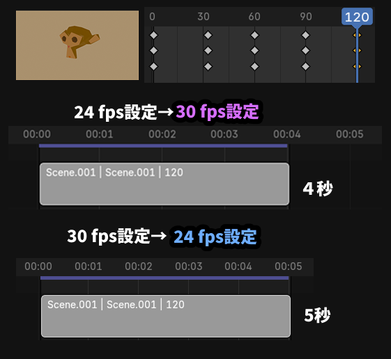 - 120フレームはそのままで時間の長さは5秒になる