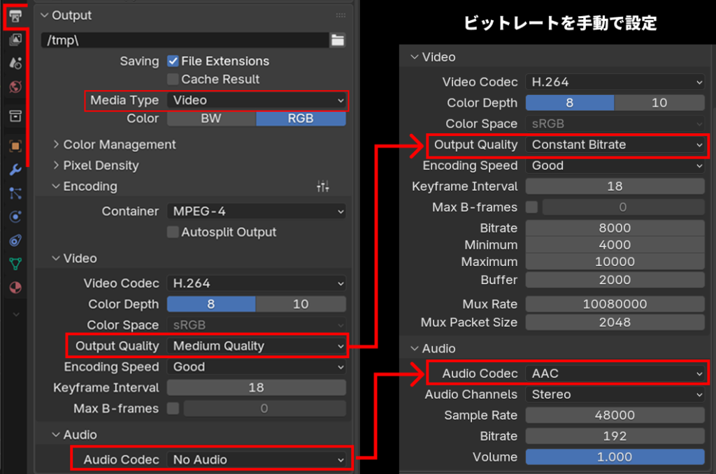 - Blenderのレンダリング設定でビットレートを手動で指定する方法