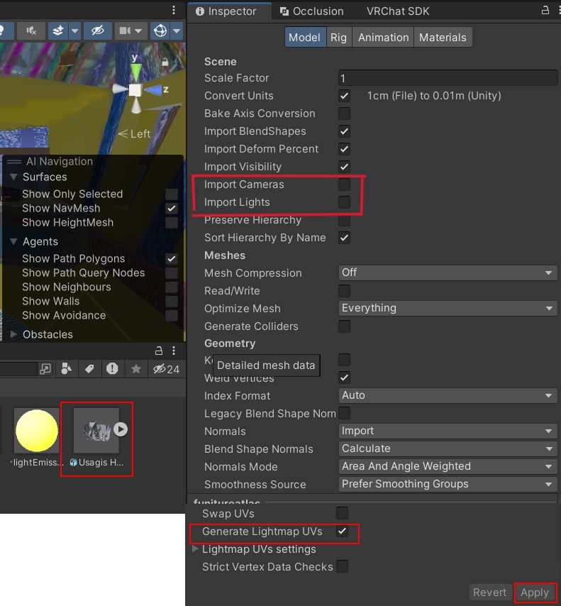 インポートしてきたFBXファイルをクリックするとImport Settingsというメニューが出ますのでその中のModelタブを開きます。
