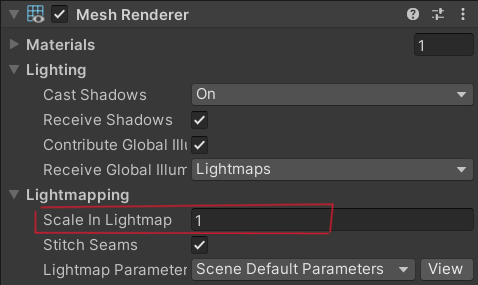 - ちなみに各オブジェクトのMesh RendererでScale In Lightmapの数値を挙げると、解像度がその倍数になり、数値を上げると細かくなる。綺麗に焼きたいオブジェクトや、つぶれてしまうときに上げてみるといいかもしれません