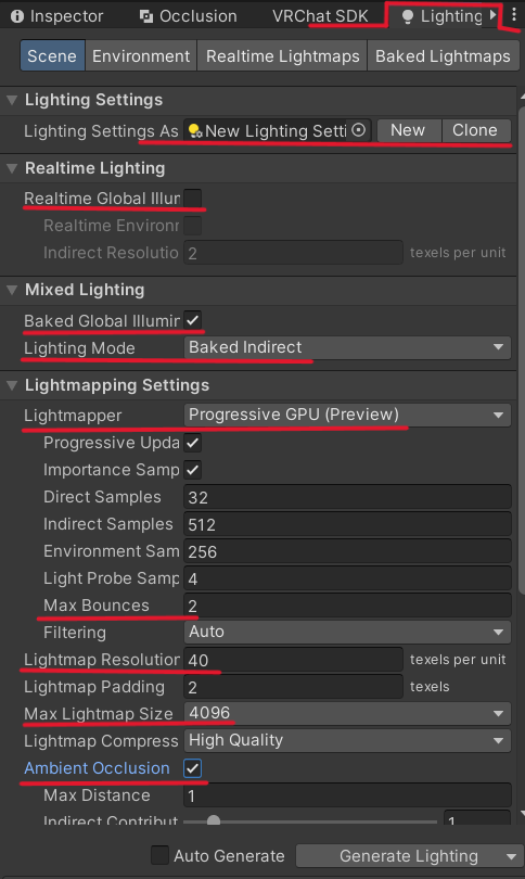 - Max Lightmap Size…サイズを大きくすると枚数が少なくて済むから良いという人もいますが、Quest対応するなら512~1024(大きくても2048まで。)PC向け、広いワールドなら2048~4096