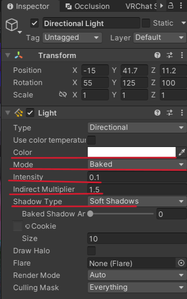例としてDirectional Lightの設定をまとめます。他のライトもほぼ同様なパラメータがあります。