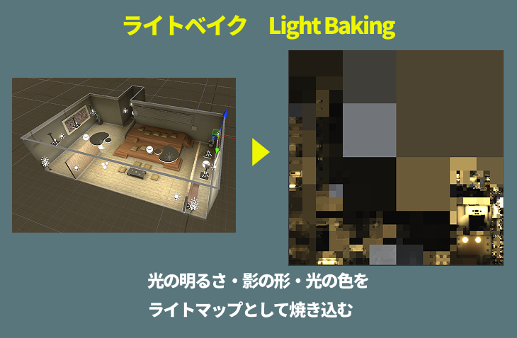 ライトベイクは、光源があるときの見え方をあらかじめライトマップとして焼き込むことで、描画負荷を下げる仕組みです。
