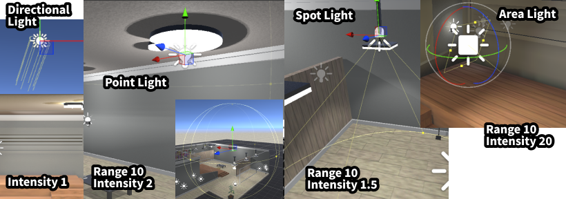 ※Unityのライトは、光源として周囲を照らすだけで、ライト自体が光って見えるわけではありません。そのため、ランプや照明モデルはEmission などで発光体を作っておくのがおすすめです。