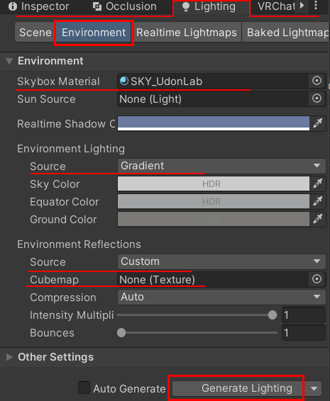 - SkyBox Material…現在設定されている Skybox マテリアルが表示されます。室内ワールドでも、環境光や反射の入力として使われる場合があります。