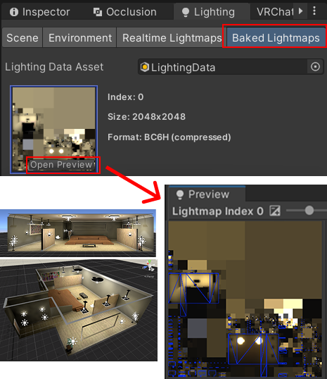 ライトマップの中のOpen Previewという部分をクリックすると、ライトマップのプレビュー画面を開くことができます。