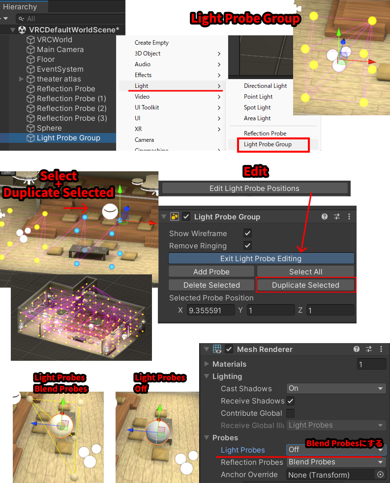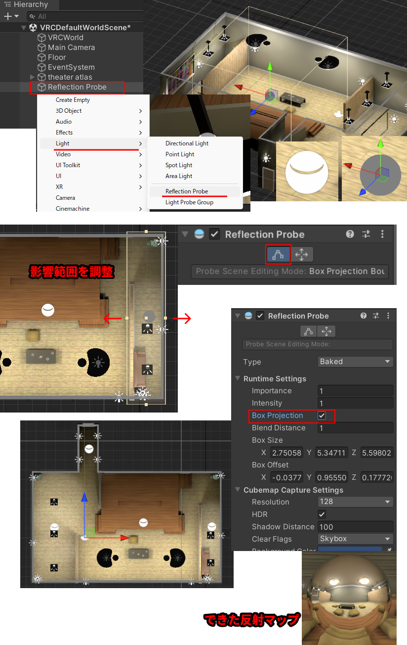 Reflection Probe, Light Probe Groupの設置の仕方も解説していますので、記事を読めばライトベイクをしてワールドのライティング、環境設定をできるようにしています。