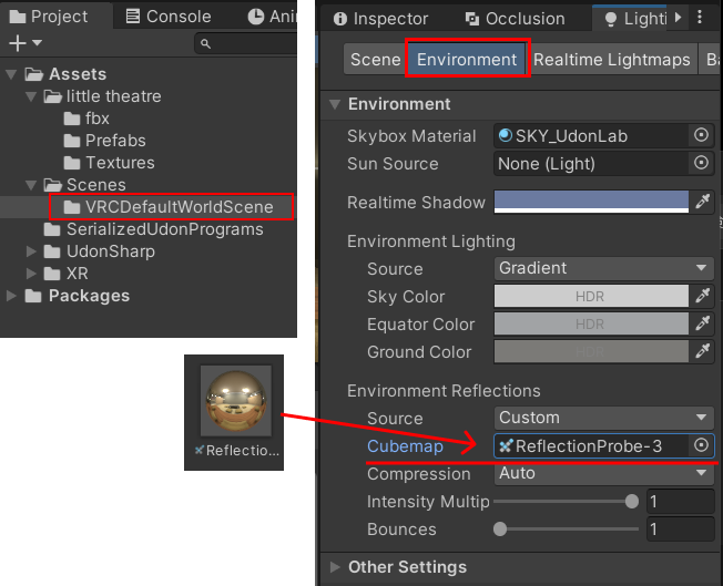 ライトベイクで反射マップが作成されたら、シーンの環境反射マップとして設定します。
