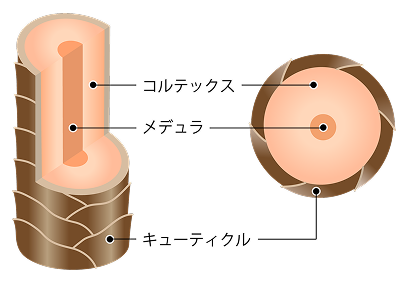 人間の髪の構造は右図のようになっていて、中心部をメデュラ、中間部をコルテックス、一番外側をキューティクルといいます。
