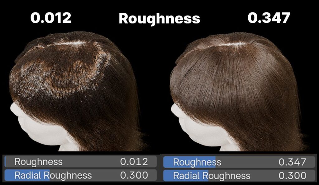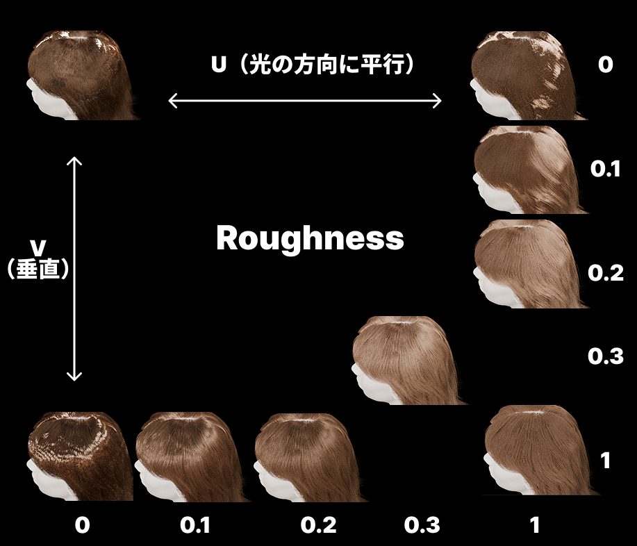 - 髪の流れ方向と直交方向でラフネスを別々に設定できる