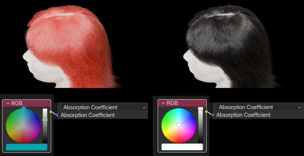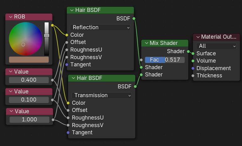 - RGBノードをそのままつないで比率を指定することも可能で、その場合は直感的に補色が髪色として表現されます。