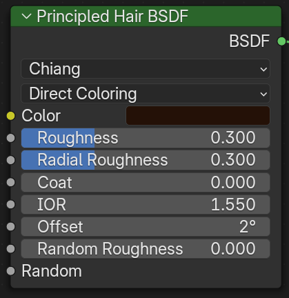 Hair BSDF ノードは、髪の毛のためのシェーディングを追加するノードです。髪の反射や透過の表現に使われます。