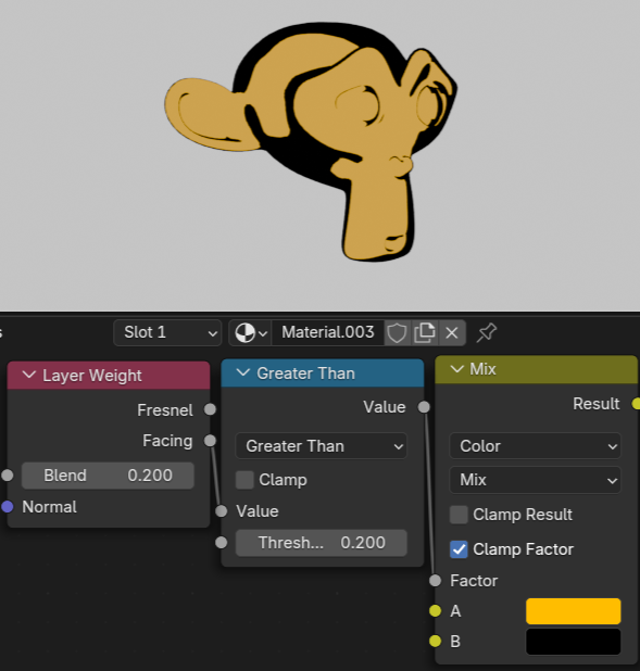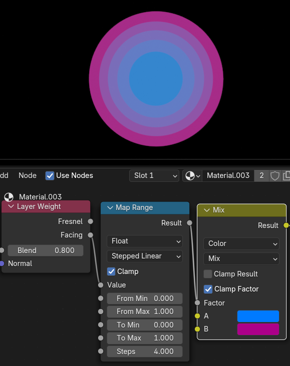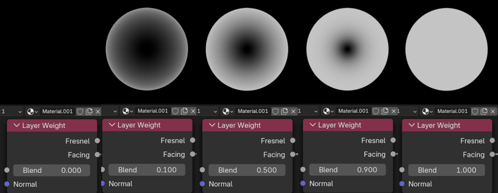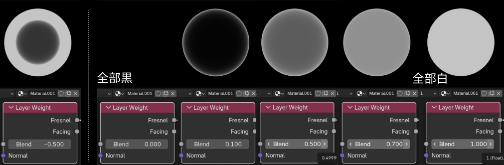 Blendのパラメータを変化させると、出力をすべて 0 またはすべて 1 に偏らせることができます。主に正面に向いている範囲の値が変化しています。0以下のマイナスの値もいれることができ、オブジェクトのフチの範囲が変化します。