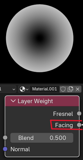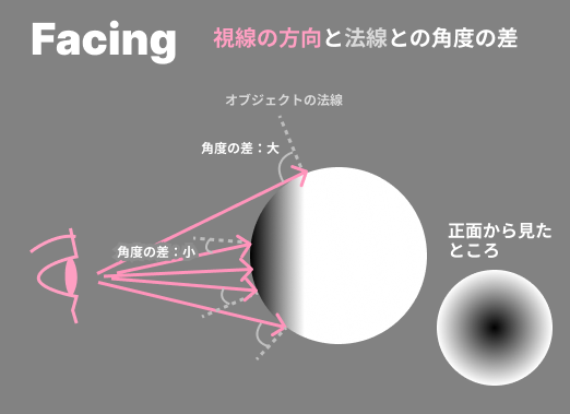 Facing(正面度)は、フレネルとは違い反射率などは関係なく、ただ視線の方向とオブジェクトの面の法線との角度の差に応じて0~1の値を出力しているだけです。