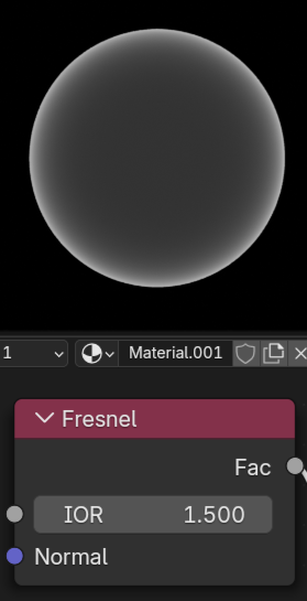 Fresnelフレネル効果を数値化したものです。角度によって反射の強さが変わる効果を、0~1 の範囲で簡単に扱えます。(※マイナスなどの値も出力することができますが、フレネル効果の値としては使われることが少ない。)