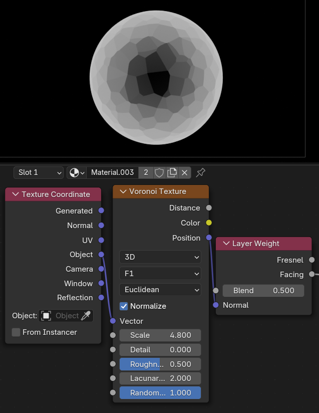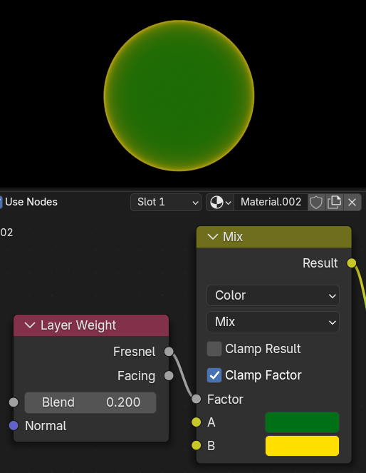 Layer WeightノードはFresnelFacingの2つの出力があり、どちらも見る角度によって0~1の値を出していますが、内容は微妙に違います。