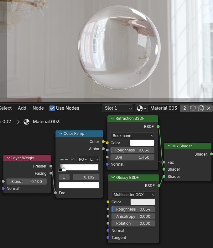 Fresnel出力から、フレネル効果を利用して、反射と屈折シェーダーをMixするファクターに使うと、ガラスなどの物質を表現できます。(実際はFresnelノードの方がIORから設定できるので使いやすいです。)