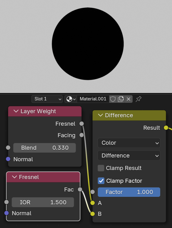 差分をとって調べてみると、Layer WeightノードでのFresnel:Blend0.33FresnelノードのIOR1.5の出力がほぼ同じ、Fresnel:Blend0.6IOR2.5の出力がほぼ同じでした。