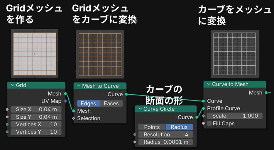 Mesh to Curveノードでグリッドメッシュをカーブに変換します。