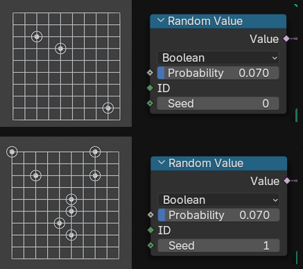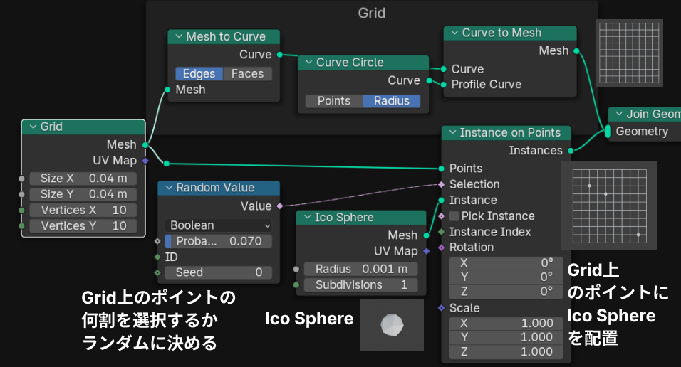 Instance on PointsノードのSelectionにRandom Valueノードをつなげます。Randome ValueノードのBooleanモードはProbability(確率)を設定でき、グリッド上のポイントの何割を選択するかを調整できます。例えば、0.3とかにすると、グリッド全体のポイントの30%を選択できることになります。今回はあまり多くのポイントを選択したくないので、0.07に設定しています(7%です。)