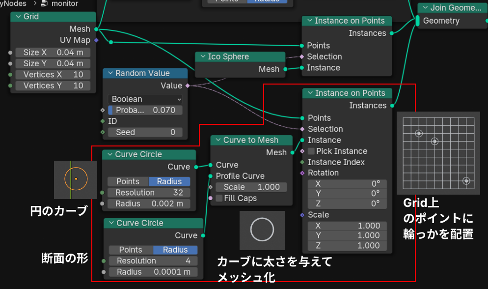 ここでインスタンスにするのは、輪っかなので、Curve CircleノードでまずRadius(半径)0.002の円を作って、Curve to Meshノードで断面の形(Profile Curve)を指定してメッシュ化します。断面の形はCurve CircleノードでResolution(頂点数)4、Radius(半径)0.0001と設定します。