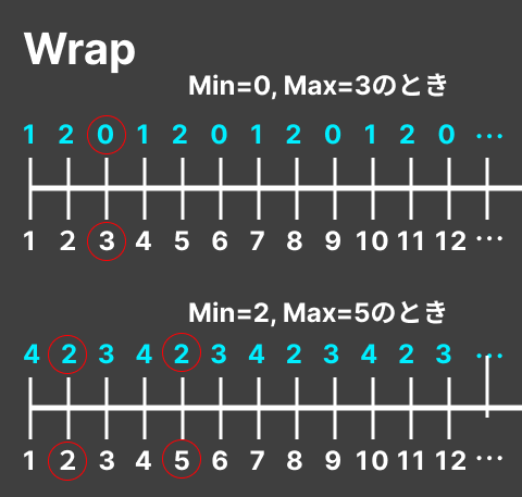 例えばMin=0, Max=3とすると、0のとき0から0,1,2…と増えていき、3のときまた0となるようなサイクルを作ることができます。