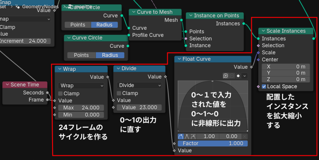 このScale InstancesノードのScaleの値を(0~1~0)に変える1秒ごとのサイクルを作っています。