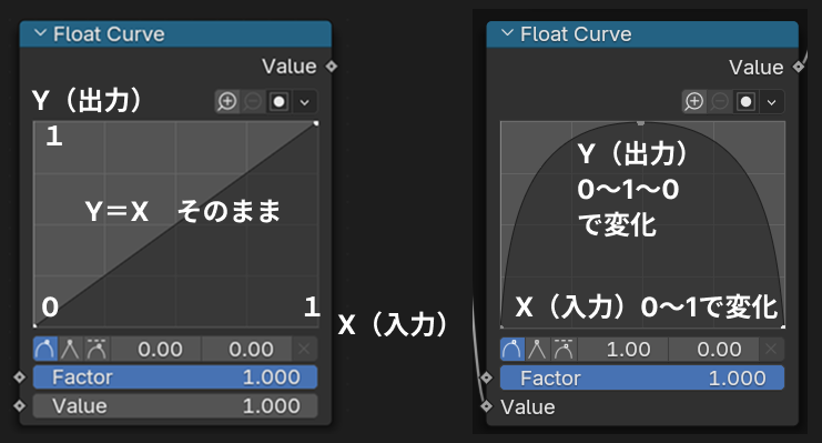 Float Curveノードは0~1の入力値を、グラフの形を使って別の出力に変えることができます。