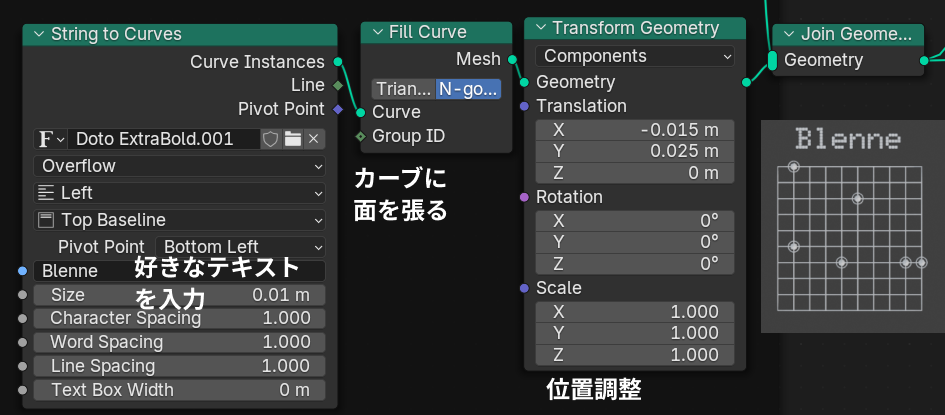 Fill Curveノードでテキストカーブに面をはります。Transform Geometryノードでテキスト位置を調整し、Join Geometryでグリッドと合体させます。