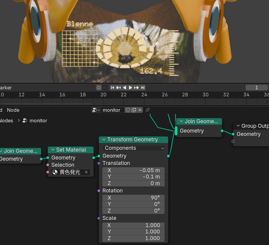 Transform Geometryノードを挟んで位置を調整し、今回の部品は完成です。