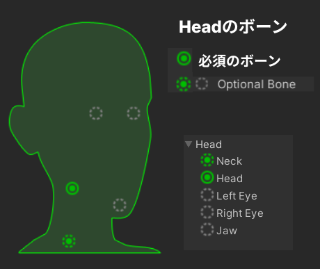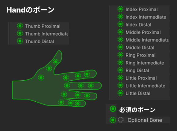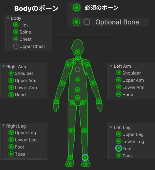 また、実線の〇がついてるのが必須のボーンで、点線の〇がついてるのが、なくてもいいオプションボーンです。