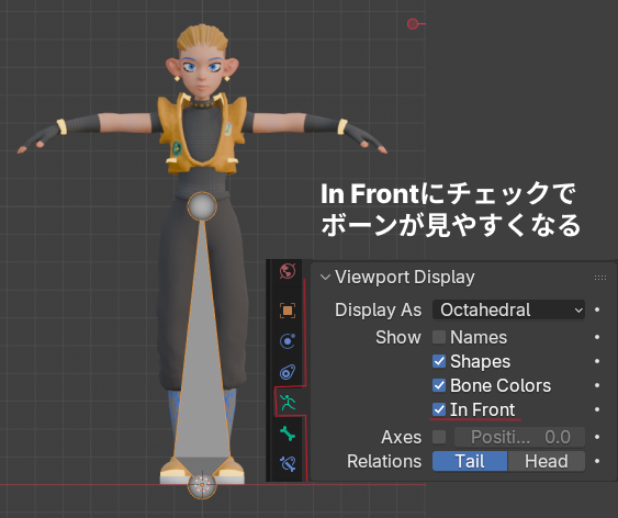 オブジェクトデータプロパティ > Viewport Display の In Front にチェックを入れることでボーンを見やすくします。