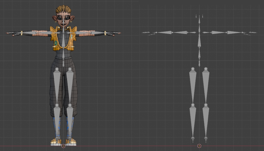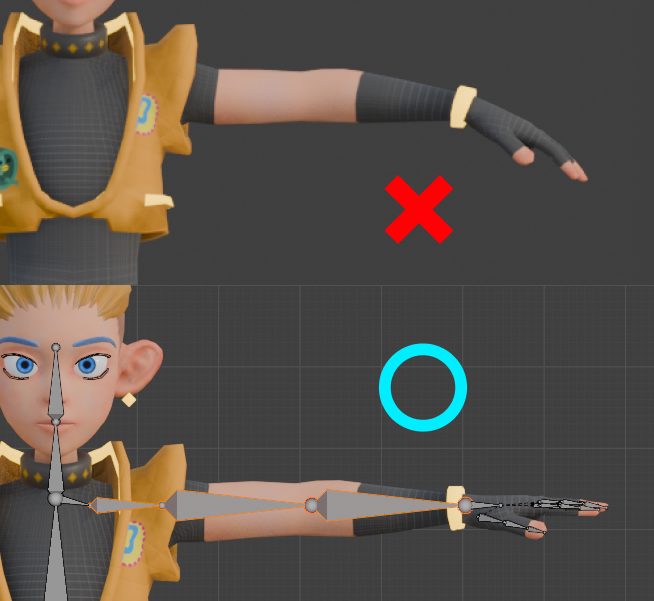 最初に作るTポーズは基準の位置となります。リグはなるべく真っすぐに作る必要があるので、リグとモデルのズレが大きくなると、フルトラなどでアバターを動かしたときに思わぬ姿勢になったり、動きがおかしくなってしまうことがあります。リグを真っすぐ作る必要があるので、なるべくそこに合わせてモデルの姿勢もまっすぐにしておきましょう。