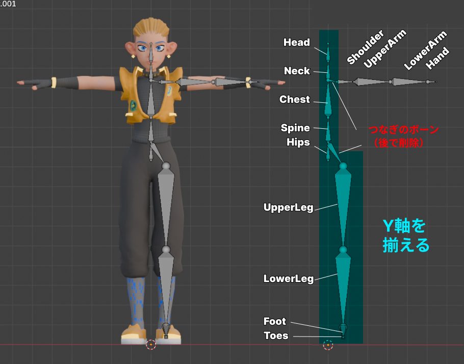 HeadからLowerLegまではY軸を揃えて、垂直に揃うようにしてください。