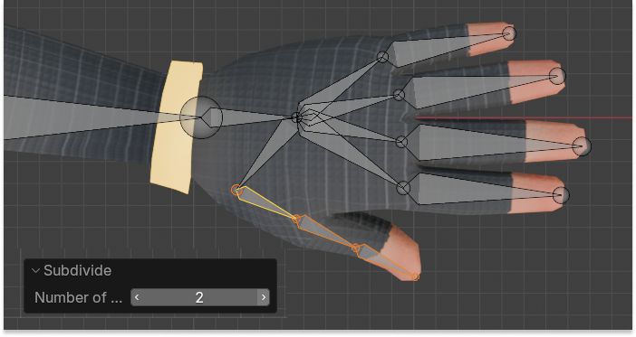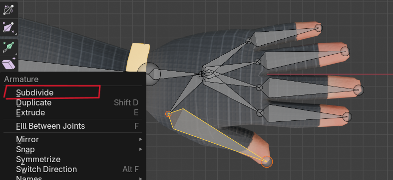 関節を細分化してボーンを分割したいので、指についてるボーンを選択して右クリック、Subdivideで分割します。