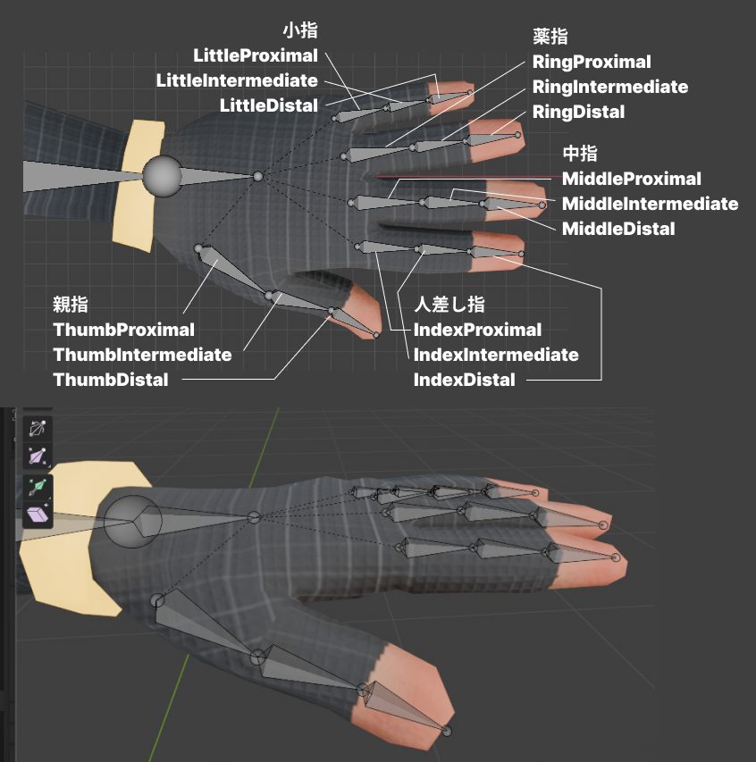 Handボーンが親になるように、それぞれの指まで、左図のようにボーンを生やします