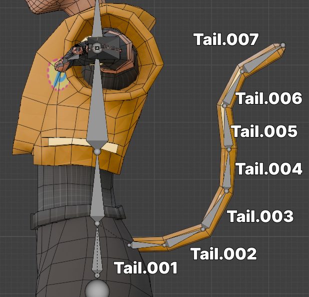 メッシュで曲がる辺が入っているところにボーンのヘッドが入るように配置していきます。(あまりボーンが多すぎると処理の負荷がかかります。今回しっぽしかないので多めにつけてますが、3~6本あたりがいいかも)