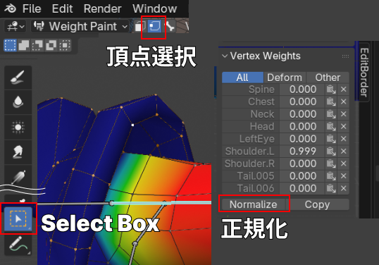 上部メニューで頂点選択を選び、左のメニューでSelect Boxにして、調べたい頂点を選択します。