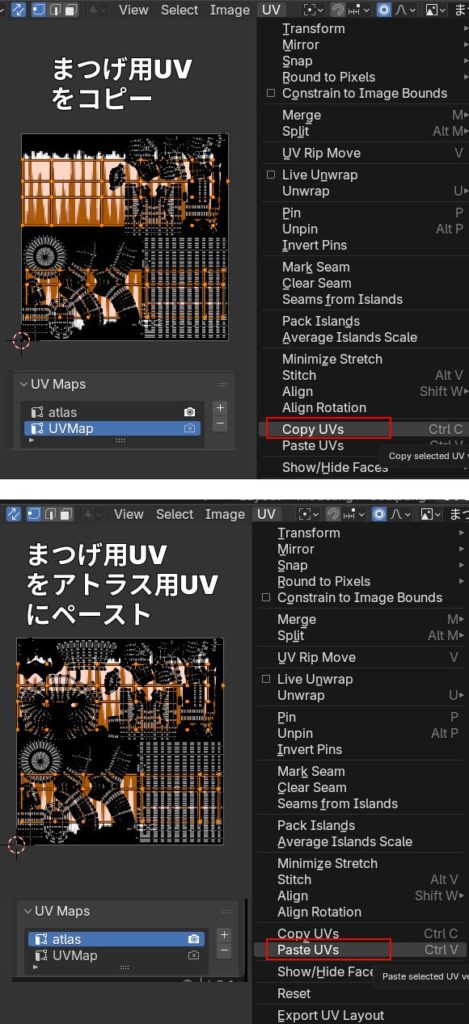 アトラスUVにいき、UV > Paste UVs でそのままの位置にコピーします。