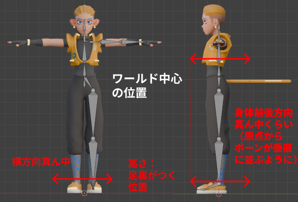 - 高さは、ワールド中心が地面の高さとなるので、そこに足裏がつくように