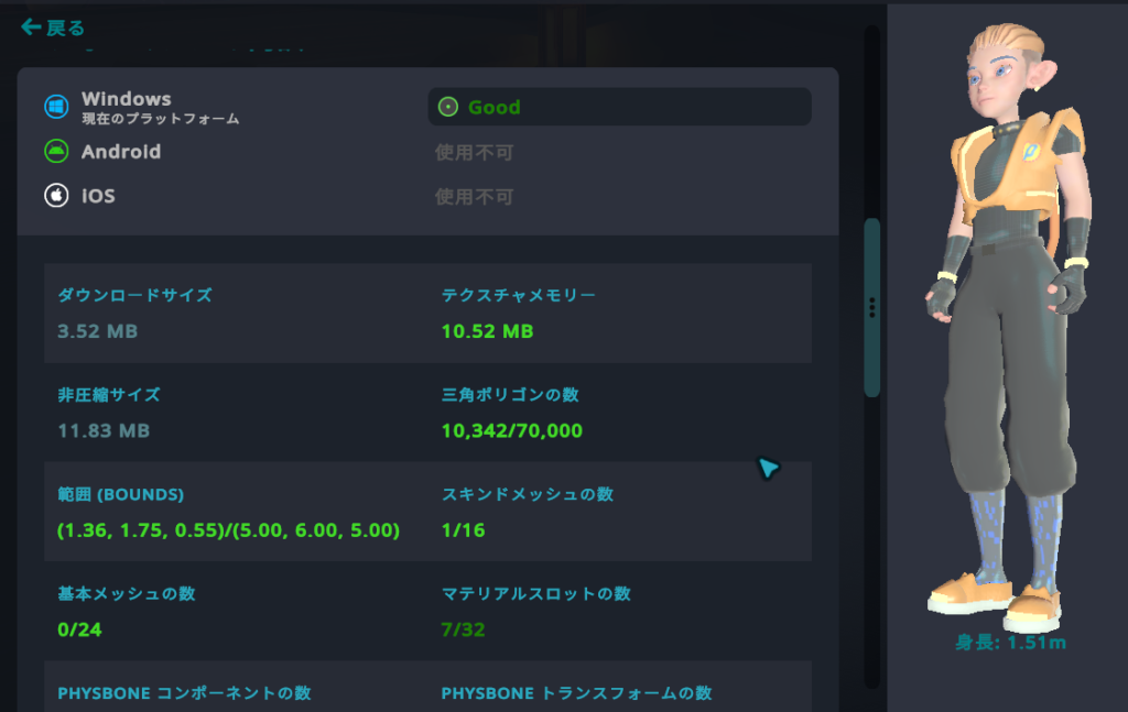 ただ、これらの推奨値を守っていると、あまりクオリティの高いモデルが出来ません。完璧に守る必要はないので、それぞれの容量が大きくなりすぎないよう意識していきましょう。評価がPoorになっても遊ぶのに支障なく動くことも多いので、最初は作りやすいように作ってみればいいと思います。段々最適化・軽量化ができるようになれば大丈夫です。