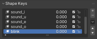 メッシュを統合したところで、まばたきアニメを作ります。リップシンクのときと同様に頭部のメッシュを選択して、Shape Keysのリストに+アイコンでblinkを追加しましょう。