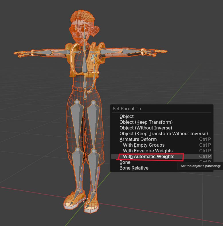 全てのオブジェクトを選択して、最後にリグを選択。Ctrl + Pでメニューが出てくるので、
